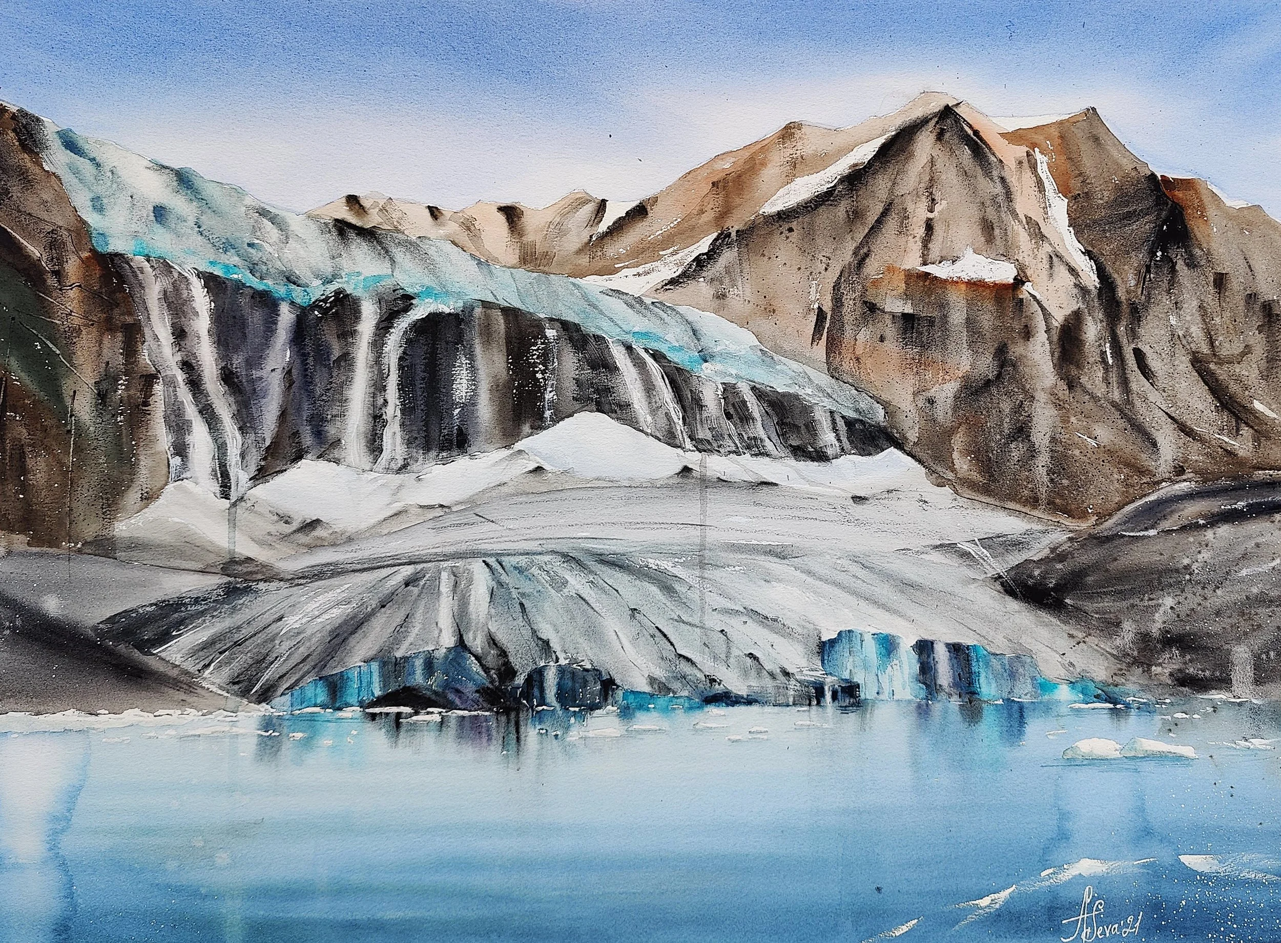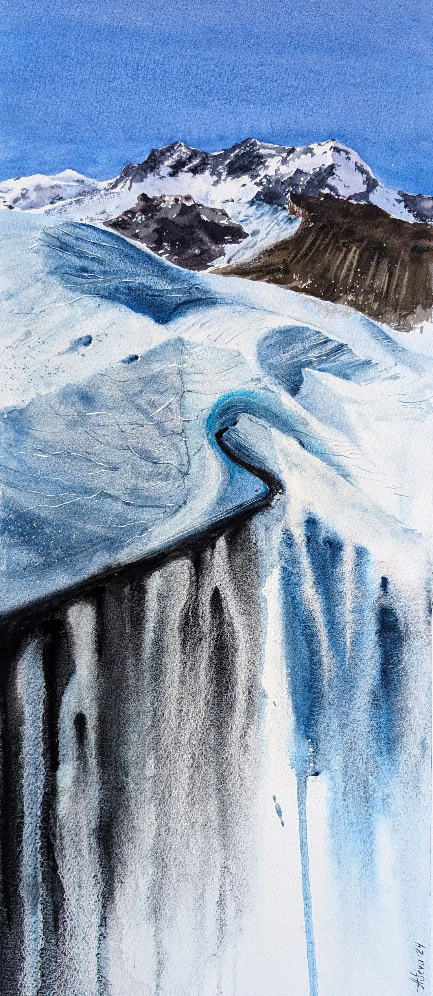 Glaciers have always been a place of peace and calm for me. They make us feel so small and insignificant, but at the same time they make us realise how big is our impact on Earth. In my paintings I am trying to represent the majesty of the glaciers that are rapidly melting, despite their awe-inspiring size.